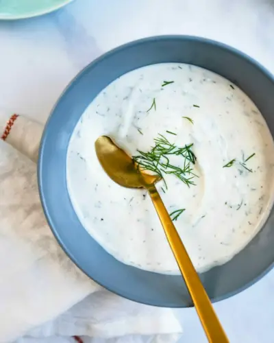 이슬비를 뿌리거나 담그기 위해 크림 소스가 필요하십니까? 이 쉬운 딜 소스를 입력하세요! 이 딜 레시피는 다목적이며 다음과 같은 모든 용도에 사용할 수 있습니다. 연어 에게 구운 채소 에게 팔라펠 샌드위치 . 가장 좋은 점은 몇 가지 재료만 준비하면 5분밖에 걸리지 않는다는 것입니다. 그릭 요거트, 신선한 딜, 레몬의 지중해 풍미가 결합되어 간단하면서도 다재다능한 아름다운 소스가 됩니다. 또한 시도해 보십시오: 정통 차치키