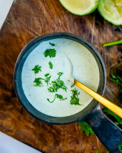 걸쭉한 크림을 지름길로 사용하는 사워 크림 레시피는 다음과 같습니다. 멕시칸 크림 . 이 징지 소스는 타코와 부리토에 얹어 먹기에 적합합니다. 동시에 고구마튀김과 새우구이에 찍어먹는 것만큼이나 맛있습니다. 강렬한 허브향이 가득하며, 빠르고 쉽게 섞을 수 있습니다.