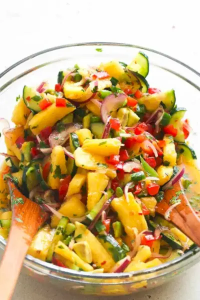 파인애플 샐러드를 꼭 프레첼로 만들 필요는 없습니다. 이 상쾌한 반찬은 즐거운 뒷마당 파티나 간단한 점심 식사 또는 사이드 메뉴로 이상적입니다! 신선한 파인애플, 오이, 빨간 피망, 고수가 들어가 폭발적인 풍미를 주는 드레싱으로 덮여 있습니다. ~을 통해 깔끔한 바이트