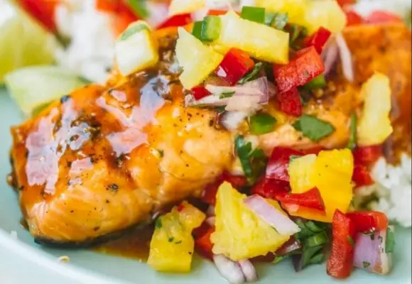 파인애플은 해산물과 완벽하게 어울립니다! 육즙이 풍부하게 구운 파인애플 연어에 군침이 도는 달콤하고 풍미 있는 파인애플 글레이즈를 바르고 그 위에 열대 분위기를 더해주는 신선한 파인애플 살사를 얹습니다. ~을 통해 대학 주부