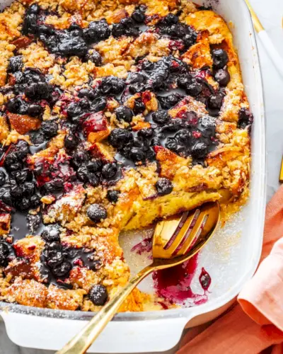 모든 것을 갖춘 브런치 레시피는 다음과 같습니다: 블루베리 프렌치 토스트 캐서롤! 이것은 누구에게나 깊은 인상을 줄 완벽한 충격입니다. 커스터디한 계피 향이 나는 빵에 반짝이는 슈트로이젤 토핑과 신선한 베리를 뿌린 후 구워보세요. 홈메이드로 마무리 블루베리 시럽 요리 전체에 톡 쏘는 베리 향을 더해줍니다!