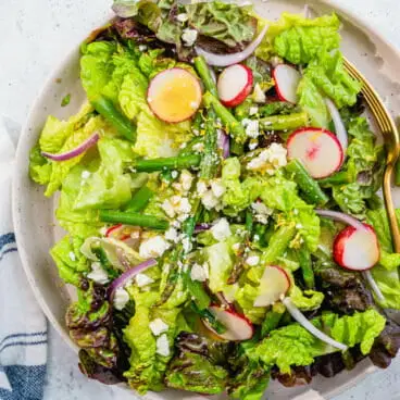 이것 아스파라거스 샐러드 레시피 야채에 레몬, 무, 페타 치즈, 톡 쏘는 디종 비네그레트를 더해 풍미가 가득합니다. 단백질이 첨가된 건강하고 만족스러운 반찬 또는 메인 코스입니다!