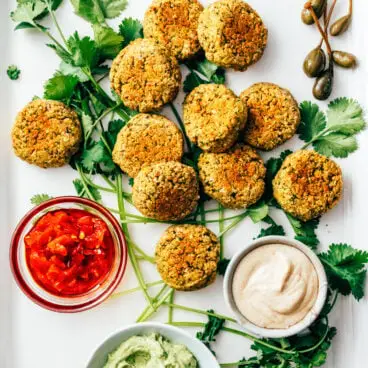 이것 통조림 병아리콩을 곁들인 구운 팔라펠 레시피는 쉽고 건강합니다! 딥, 피타, 샐러드 등에 곁들여 드세요.