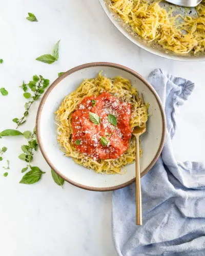 모두가 좋아하는 스쿼시를 먹는 가장 좋은 방법은 무엇일까요? 이 스파게티 스쿼시 스파게티 국수는 허브로 볶은 다음 마리나라와 파마산 치즈를 얹습니다.