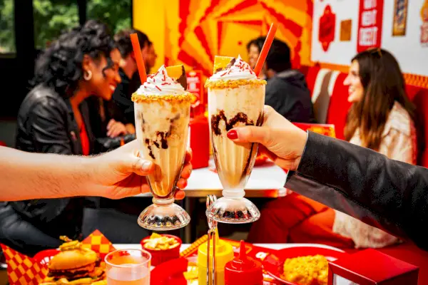 과자 없이는 길가 식당이 아니기 때문에 브랜드는 몇 가지 디저트 옵션에도 짭짤한 스낵 크래커를 주입했습니다. 그만큼 디럭스 치즈잇 밀크셰이크 바닐라 베이스에 Cheez-Its를 섞은 후 휘핑 크림, 초콜릿 시럽, 스프링클, 캐러멜 치즈 크래커 테두리를 장식하고 체리 대신 초콜릿을 얹은 Cheez-It을 그 위에 얹습니다. .