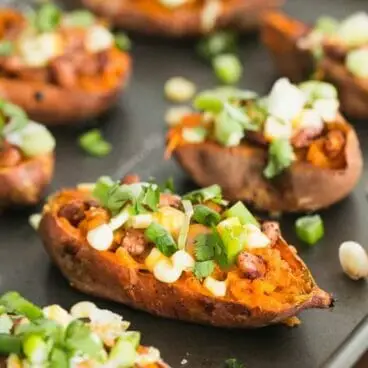 바삭바삭한 고구마 껍질 위에 치즈 향이 나는 끈적한 속, 칠리 향이 나는 핀토빈, 바삭바삭한 파를 얹은 모습을 상상해 보세요. 완벽한 파티 전채 요리!