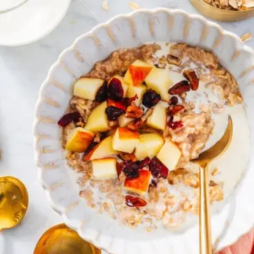 전자레인지 오트밀에 좋아하는 오트밀 토핑을 얹어 포만감 있고 건강한 식사로 만들어보세요! 우리는 약간의 땅콩버터, 메이플 시럽, 그리고 약간의 우유(또는 풍부한 맛을 더해주는 약간의 헤비 크림)를 곁들여 먹는 것을 좋아합니다. 다음은 몇 가지 토핑 아이디어입니다.