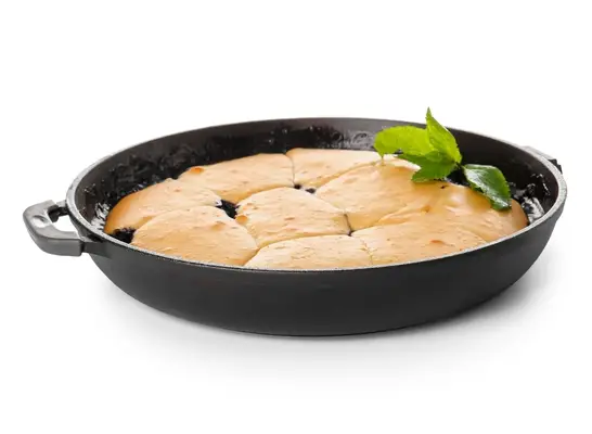 레시피에서 비스킷 코팅은 밀가루, 베이킹 파우더, 베이킹 소다 및 차가운 버터 큐브로 반죽으로 자릅니다. Sidati는 1/2 프라이팬 또는 주철 팬으로 슈 메이커를 만들어보십시오.