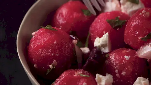 활성 시간: 10분 총 시간: 10분 생산량: 12인분이 쉬운 수박 샐러드는 따뜻한 태양 아래 야외에서 먹기에 이상적입니다. 수박과 민트는 상쾌하고 풍미가 넘치며, 짠 올리브와 페타는 풍미 있는 대위법을 제공합니다. 요리사 Jacques Pépin은 멜론 볼러를 사용하여 작고 씨 없는 수박을 둥글게 자르지만(낭비하지 않도록 샐러드에 트리밍도 추가) 원하는 경우 원하는 크기의 수박을 입방체로자를 수 있습니다.