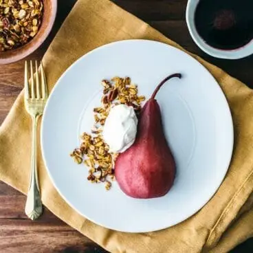 이 놀라운 데친 배 레시피는 매콤한 레드 와인으로 조리한 배에 피칸 그래놀라와 홈메이드 휘핑 크림을 곁들여 먹는 것이 특징입니다.